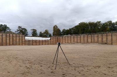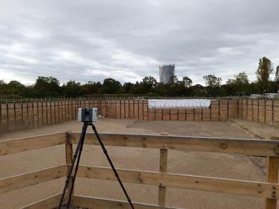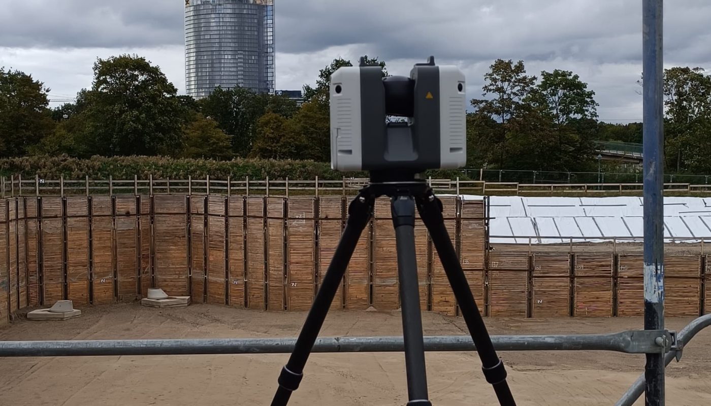 Nach einer Begehung der Baugrube vor Ort sind die Dimensionen dieser das erste Mal greifbar: ca. 110m x 70m x 7m. Da in unmittelbarer Nähe Ministerien des Bundes liegen ist die Option, die Baugrube mit einer Vermessungsdrohne zu befliegen kurzfristig nicht umsetzbar, sodass das Aufmaß mit einem Laserscanner durchgeführt wird. Für eine spätere Georeferenzierung werden schwarzweiß Targets platziert und tachymetrisch aufgemessen, anschließend die Baugrube und Teile des umliegenden Geländes mit einem Leica RTC360 gescannt.