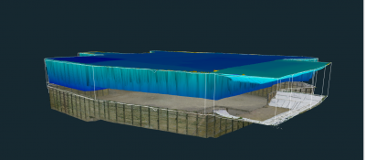 Im Innendienst werden die Punktwolken der Standpunkte verknüpft und über die gemessenen Targets georeferenziert. Die Auswertung dieser Punktwolke setzt sich in diesem Fall aus zwei Ansätzen zusammen. Es soll zum einem das Volumen mit der in der Software 3Dsurvey bereitgestellten Funktion berechnet werden, zum andern soll die Berechnung über das Ableiten von CAD-Punkten aus der Punktwolke erfolgen. Die zweite Berechnung wird als Plausibilitätsprüfung des ersten Ansatzes gemacht.
